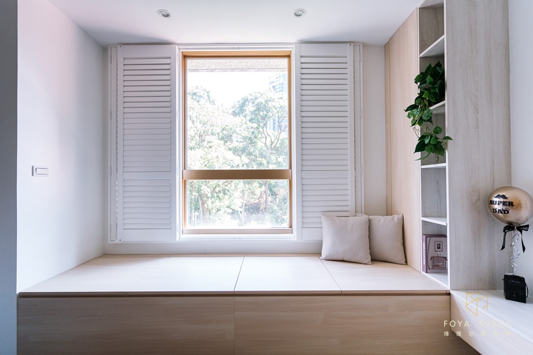 窗台高度. 窗台旁以系統櫃打造舒適閱讀角落,鋁窗採上下分割設計,搭配百葉窗營造靜謐質感氛圍。